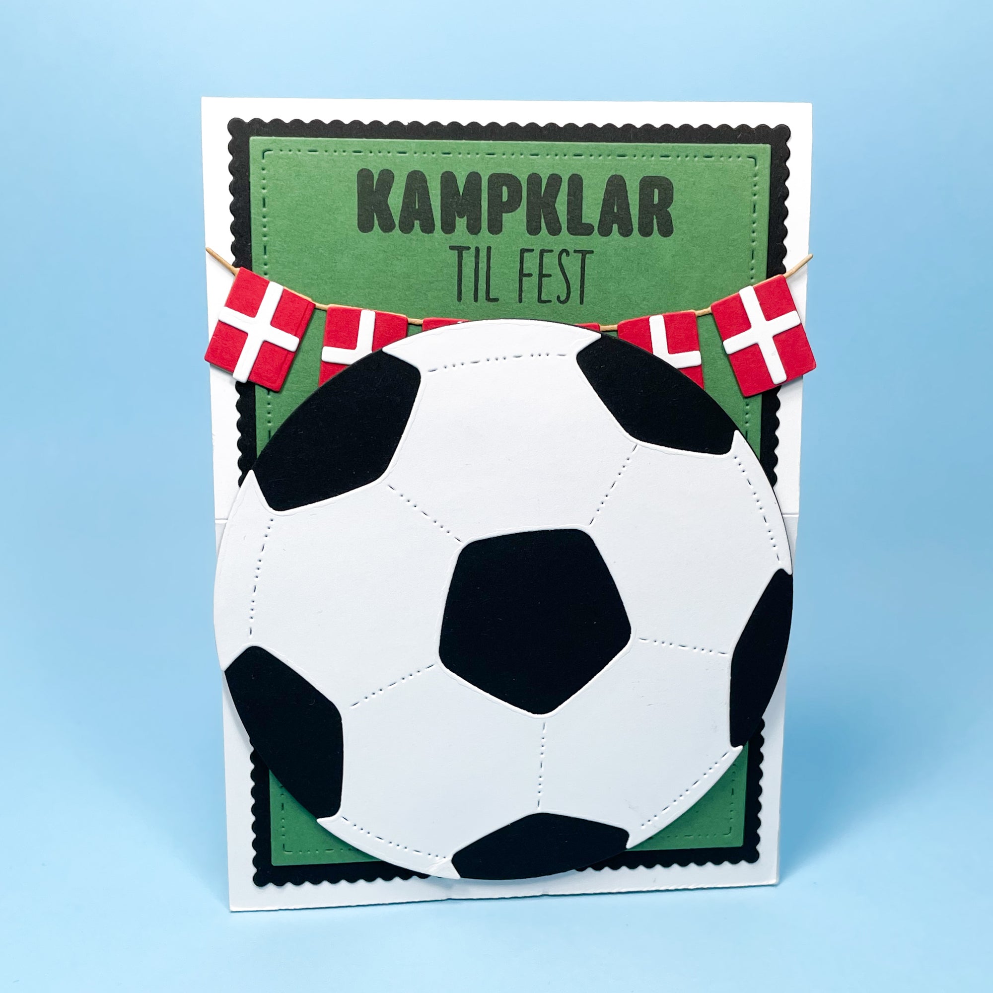 Med denne pakke kan du udstanse en fin banner med plads til 6 dannebrog flag. Hvert flag udstanses i 2 dele, så der kommer ekstra fine detaljer, og der kan udstanses i forskellige farver. Udstansningerne samles nemt med lidt lim.