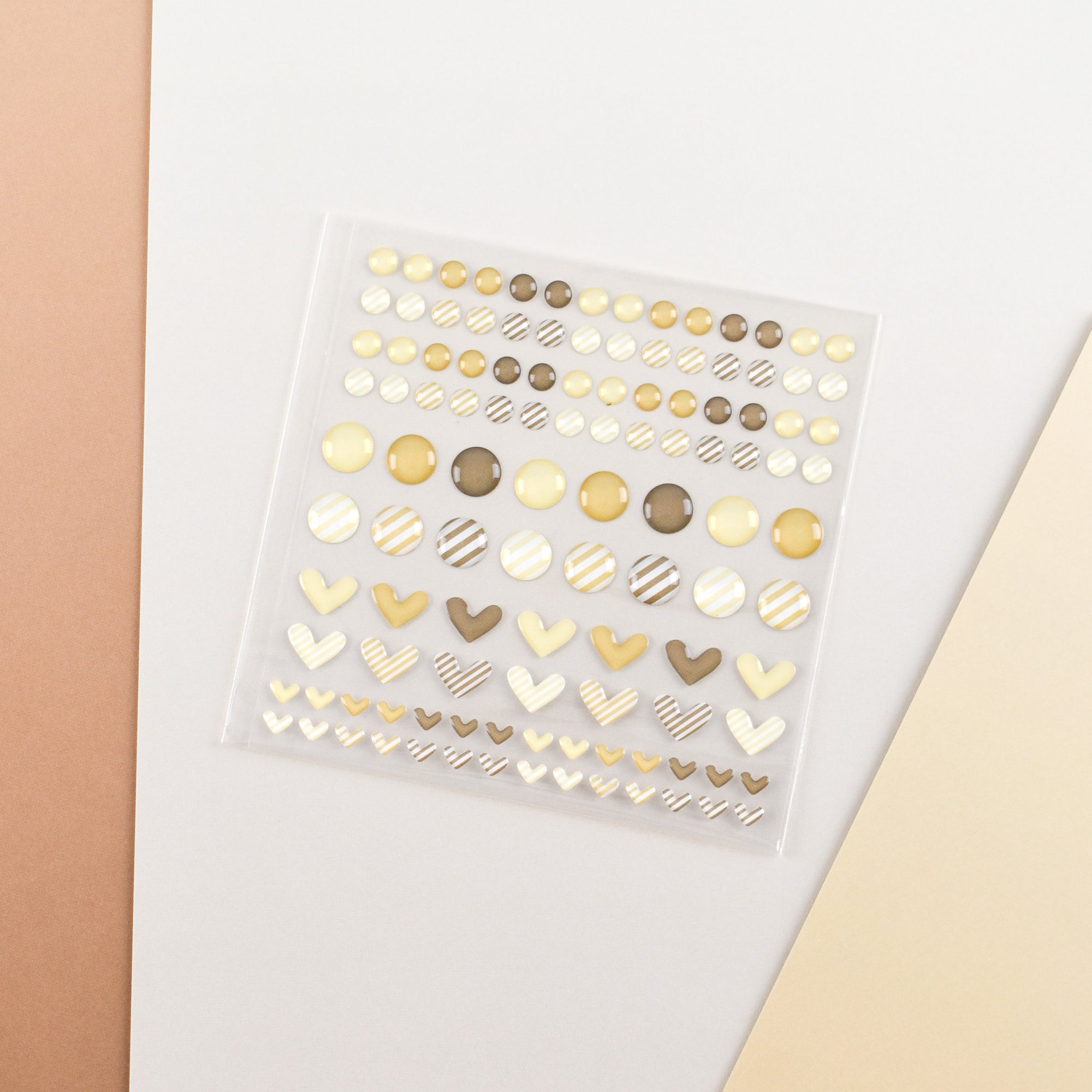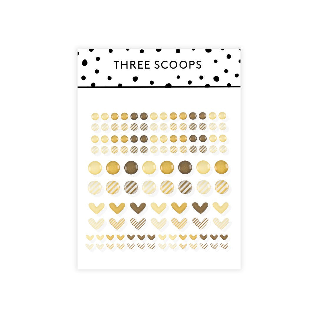 Små blanke, selvklæbende halvperler, som kan benyttes til pynt på diverse papir projekter. Her i denne pakke kommer de i små og store cirkler samt små og store hjerter.