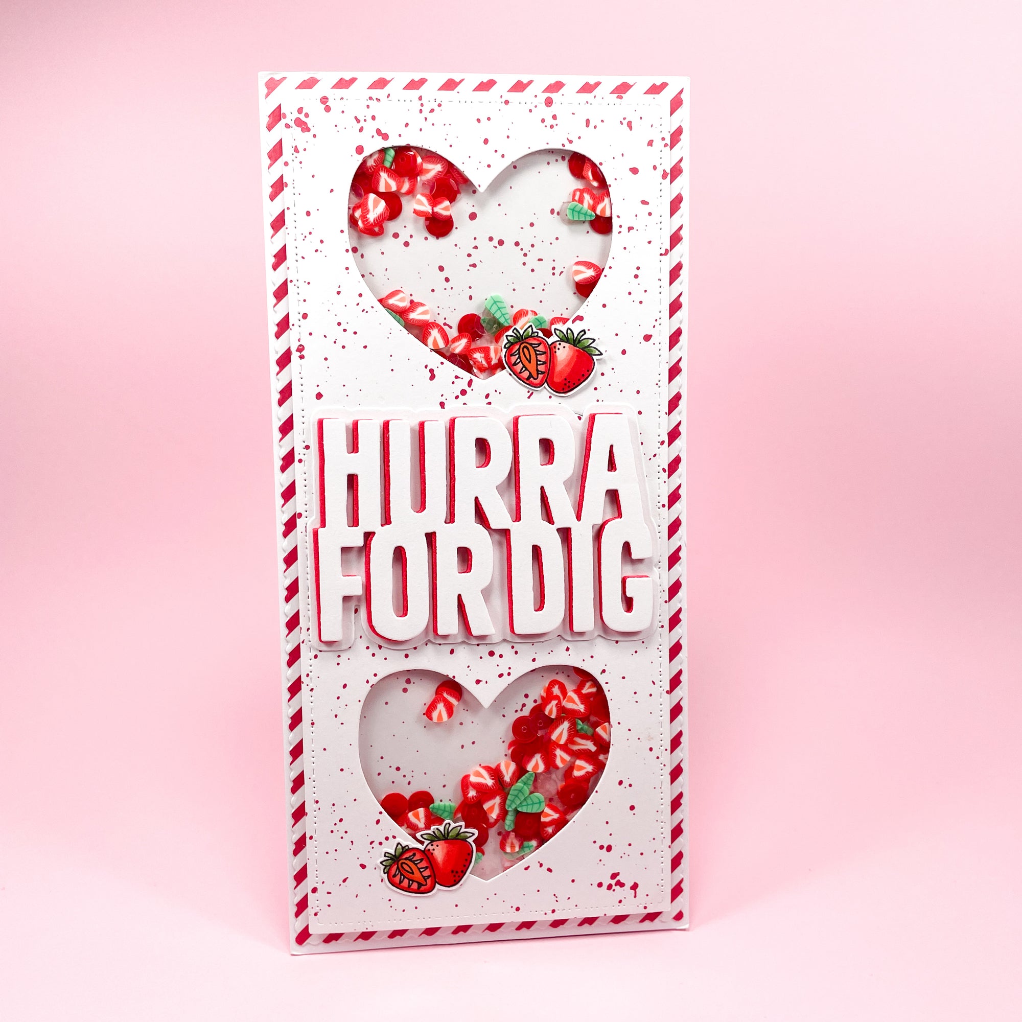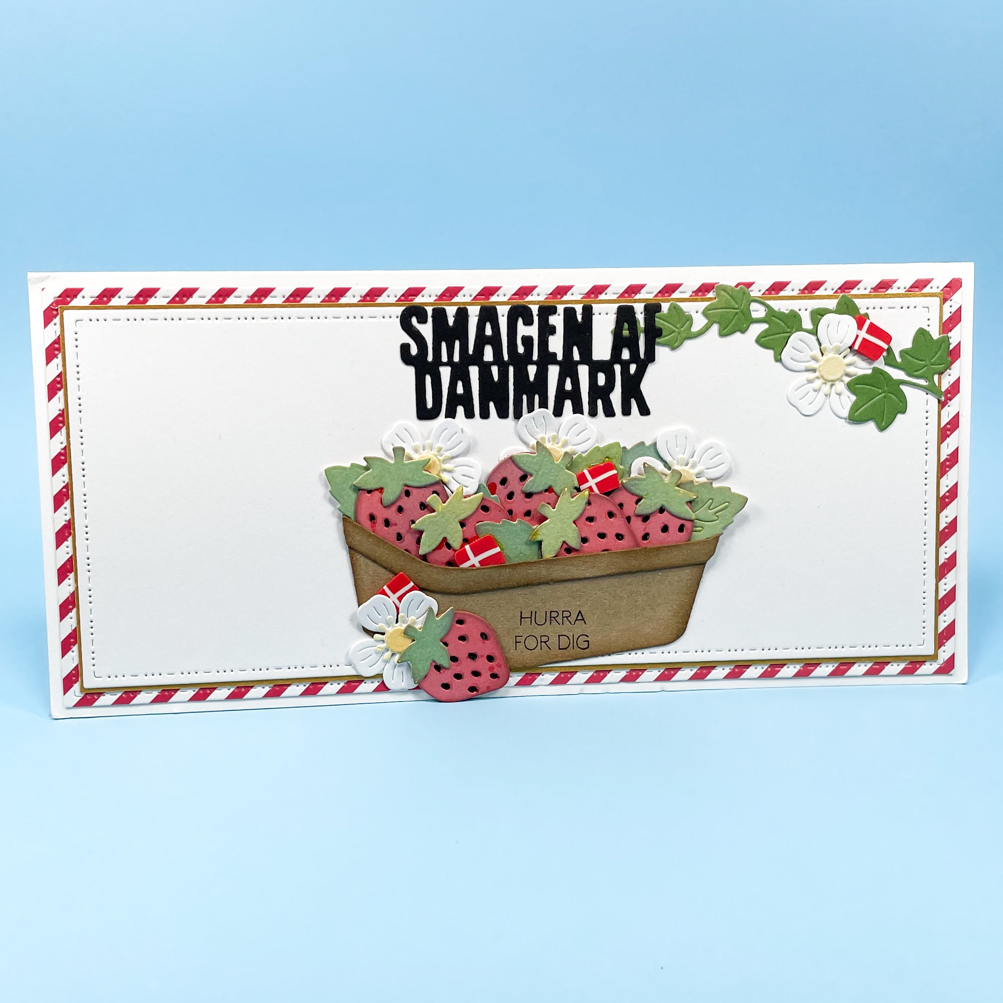 Du får I alt 9 slimline dies (aflange firkanter). De er lavet så de passer perfekt som baggrundsdies på slimline cards. Baggrunden vil ikke gå helt ud til kanten af kortet men give vidt plads så kortet har en ramme. Ved alle dele er der små detaljer i kanten i form af Three Scoops genkendelige mønster med én streg og tre prikker.