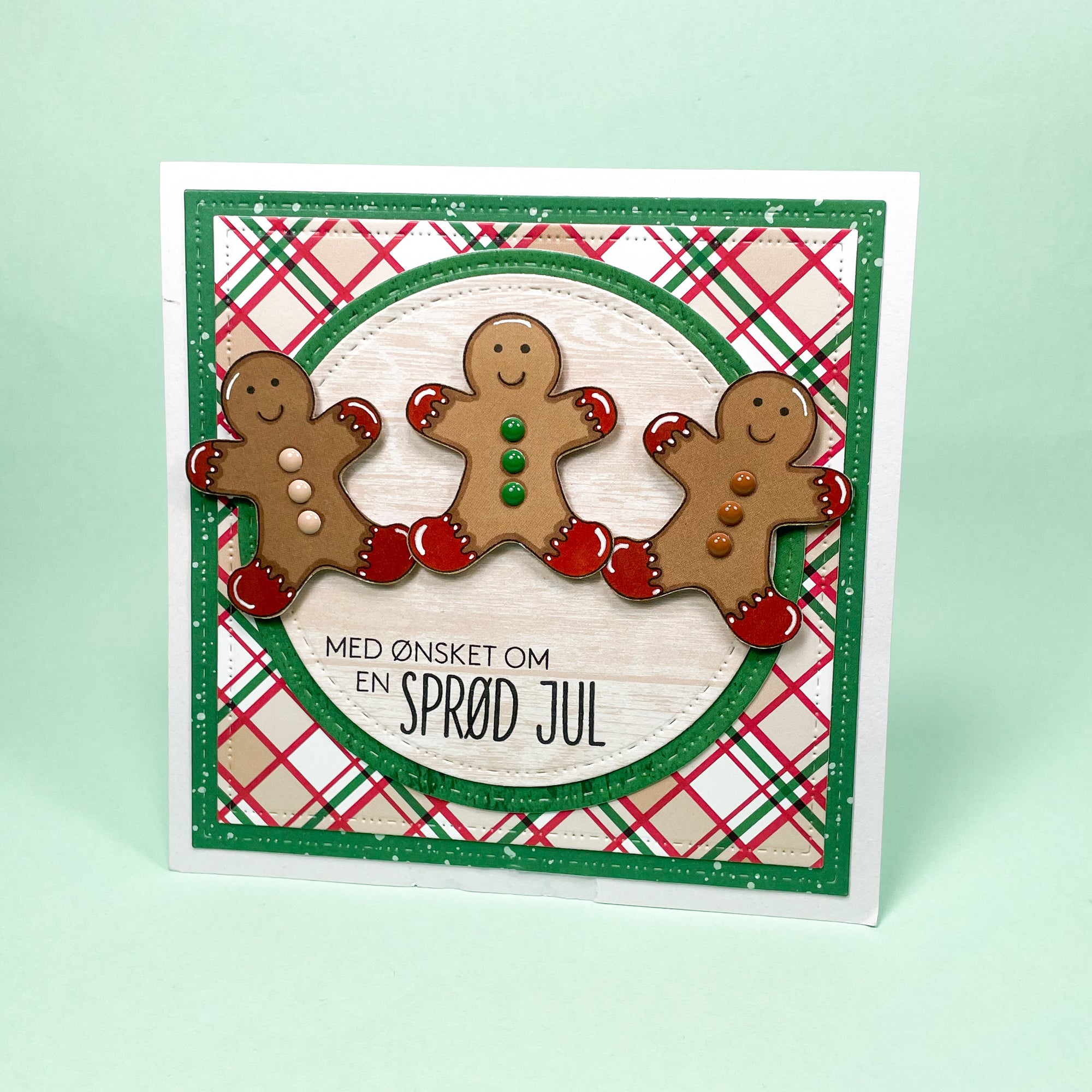 Lille stempelpakke med kagemand, og teksten 'Sprød jul