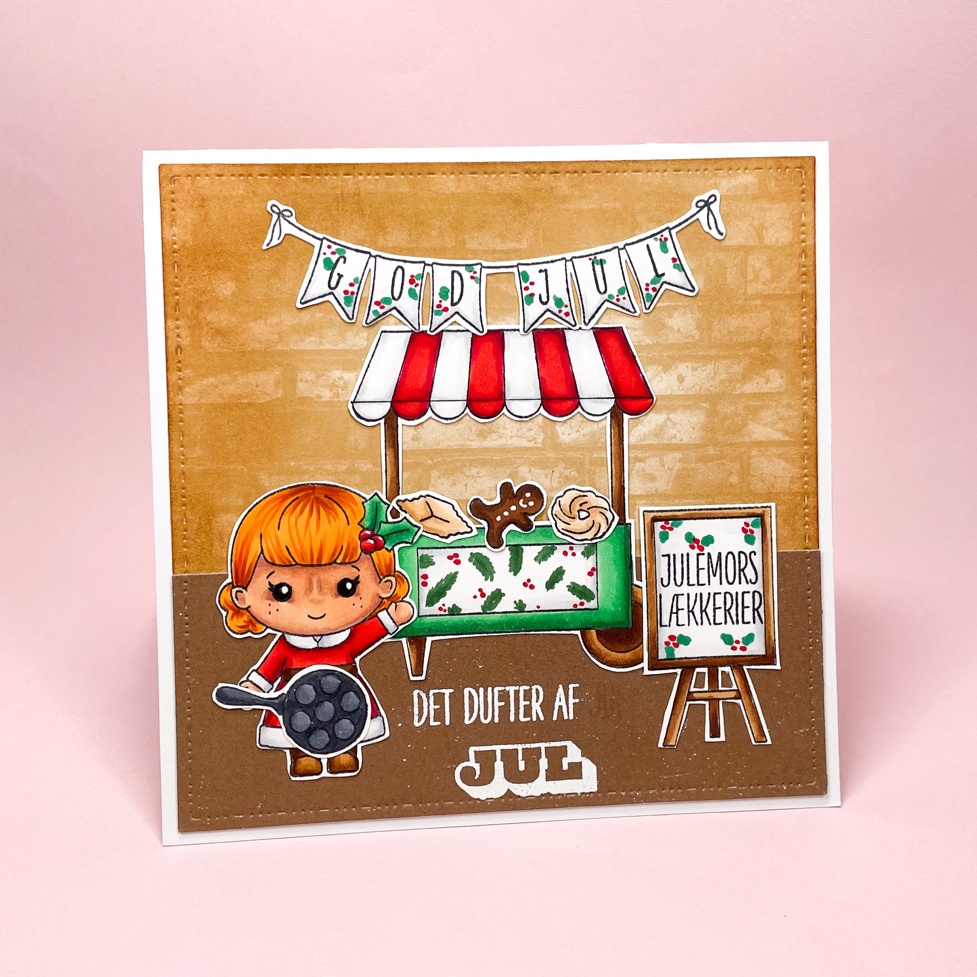 Stempelsættet indeholder en fin julemor med forklæde, samt en flagbanner med teksten 'God jul'. Til julemor er der også en æbleskivepande, en lille vaniljekrans, en klejne, og en kagemand.
