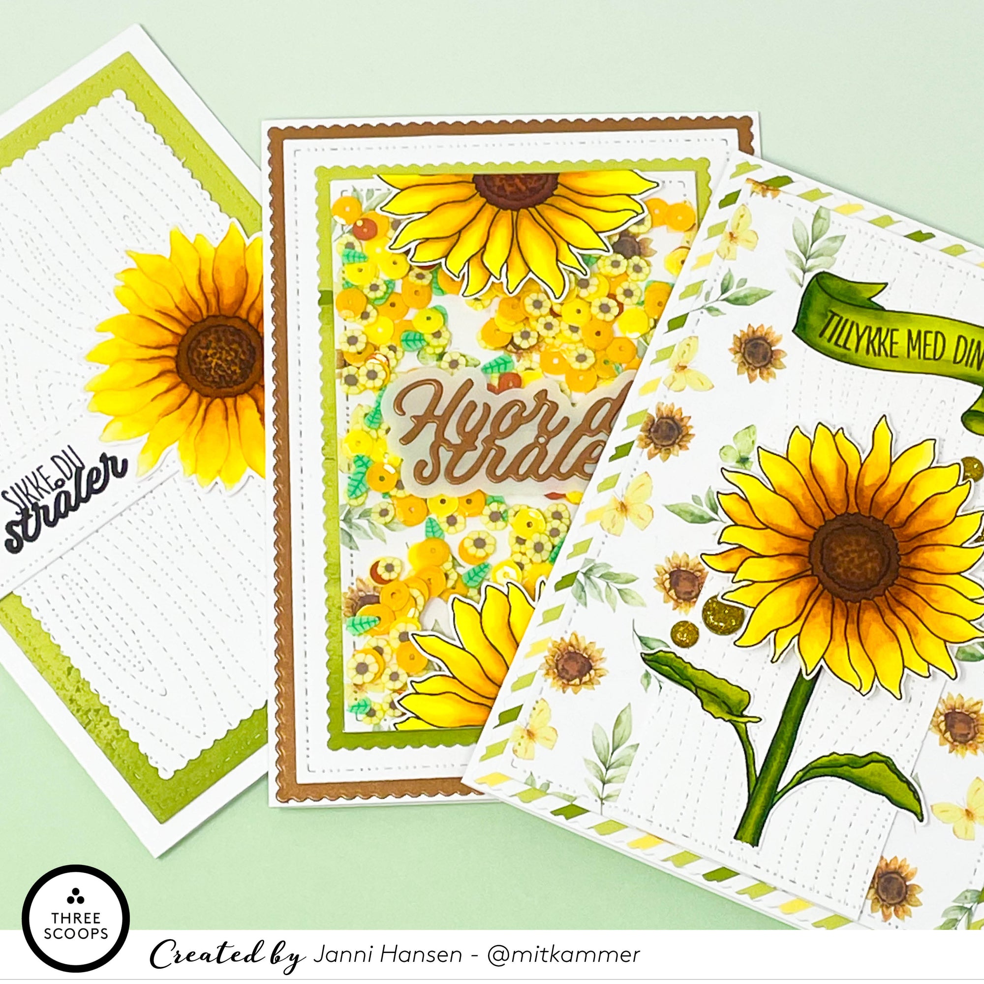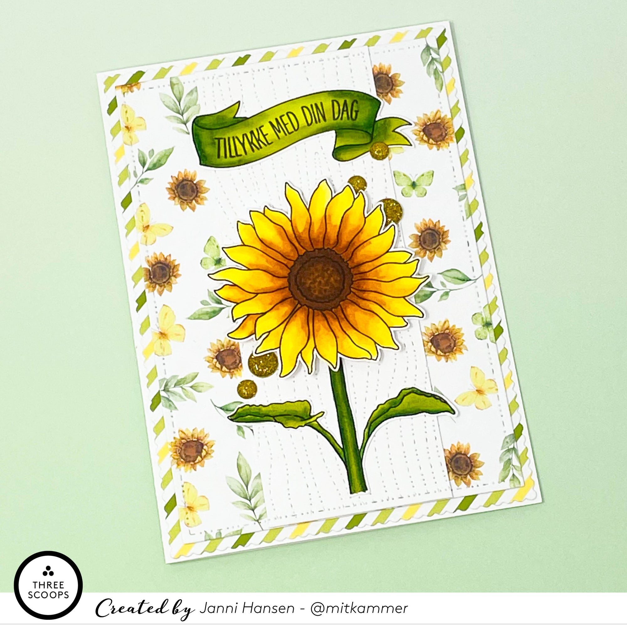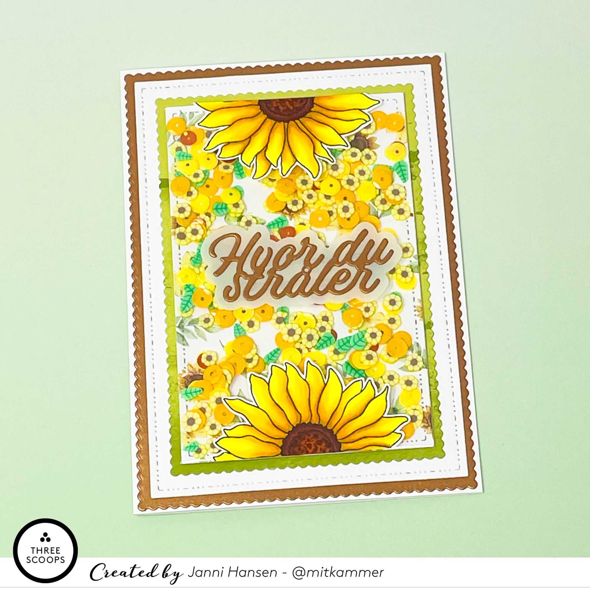 Pakken indeholder et stempel med solsikker, en paillet blanding med solsikker, en tekst die med teksten Hvor du stråler, samt papir.