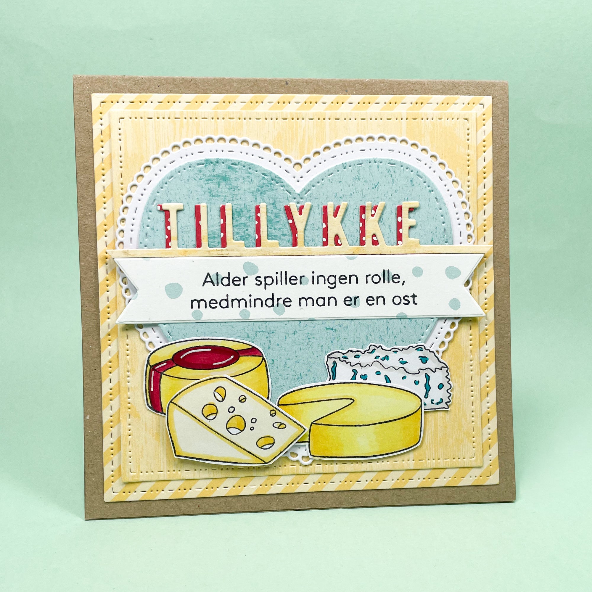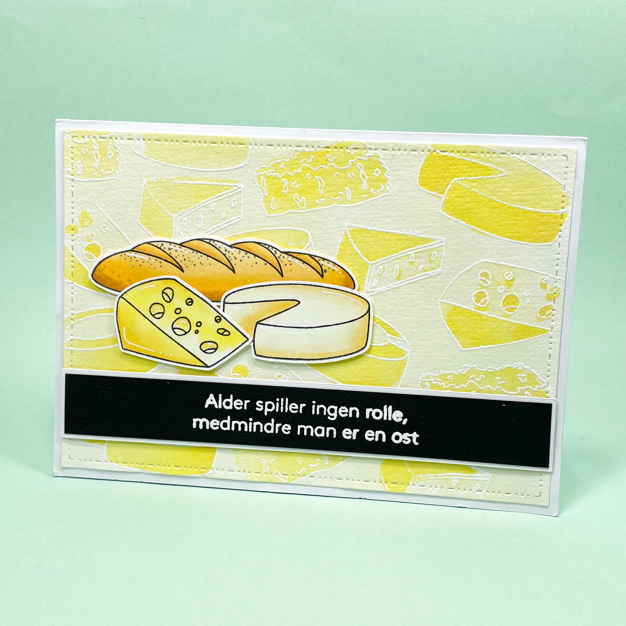 Et stempelsæt med 5 forskellige oste og tilhørende humoristisk tekst: