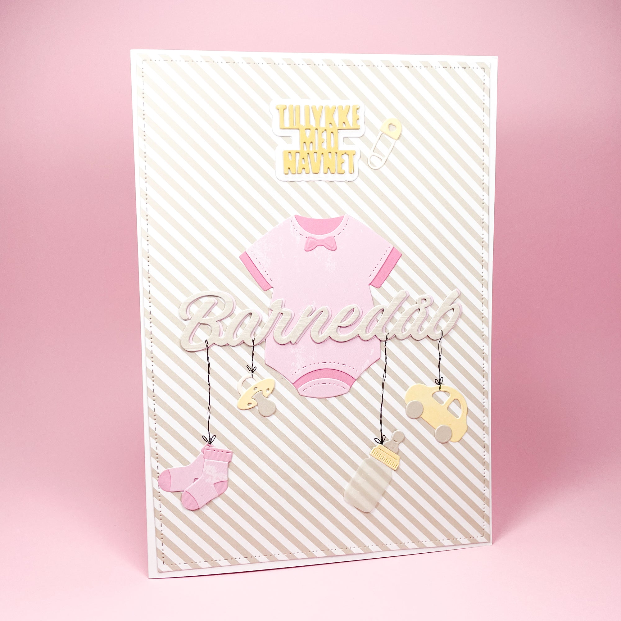 Sparkedragt die der udstanser en fin sparkedragt, en lille babystrømpe, samt en sløjfe, fyldt med detaljer.