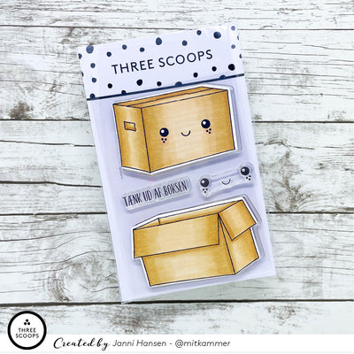 Stempelsættet indeholder to stor flyttekasser, samt et lille ansigt der kan stemples på flyttekasserne.